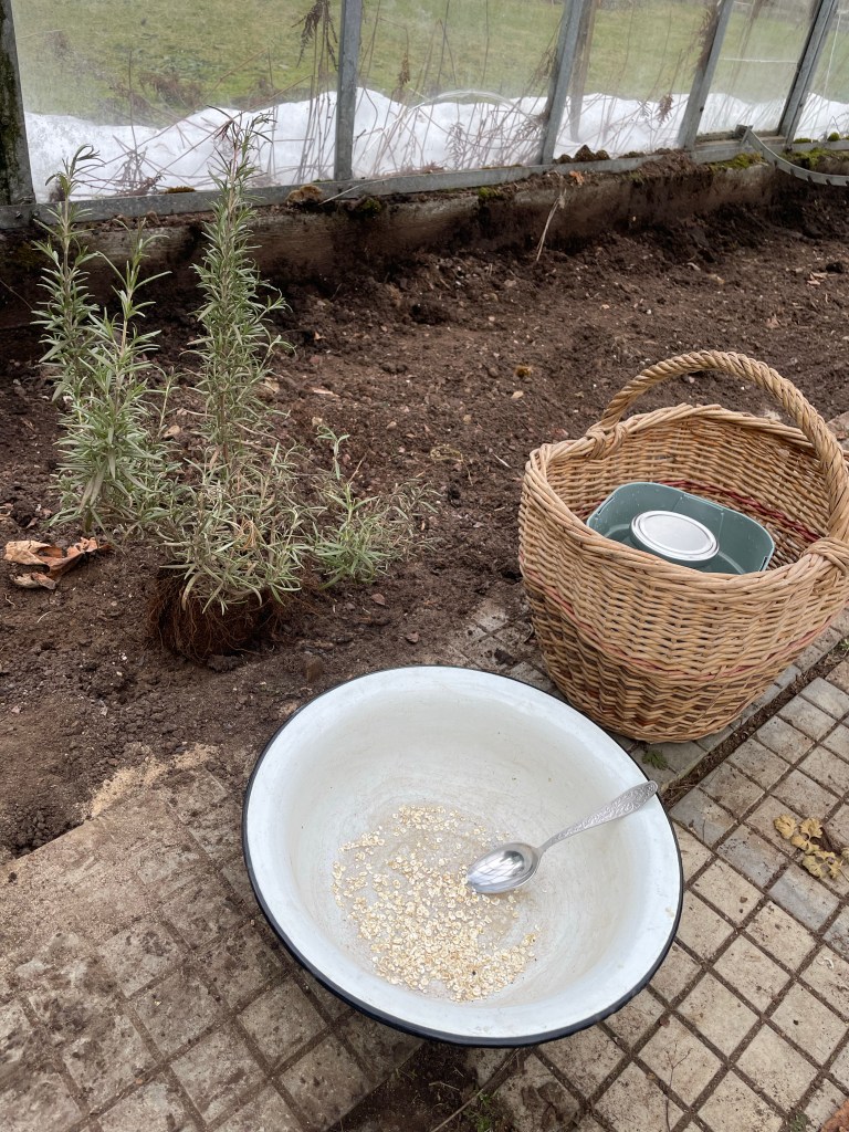 Finishing the post with something CUTE, and I bring you a picture of the rosmary I saved during the soil removal. I spotted this trick on the internet where you mix oats & epsom salt to help plants recover faster from transplanting shock. I thought I would give this experiment a try; the rosmary has gone through tough times anyway. I guess it couldn’t hurt it more than what it has already experienced. Right now, it still looks a bit colourless, but we will see if the trick works. I think the plant is still alive? Fingers crossed.
