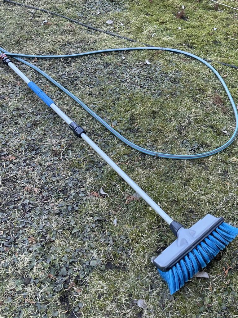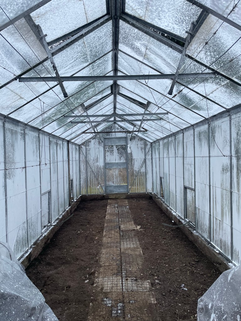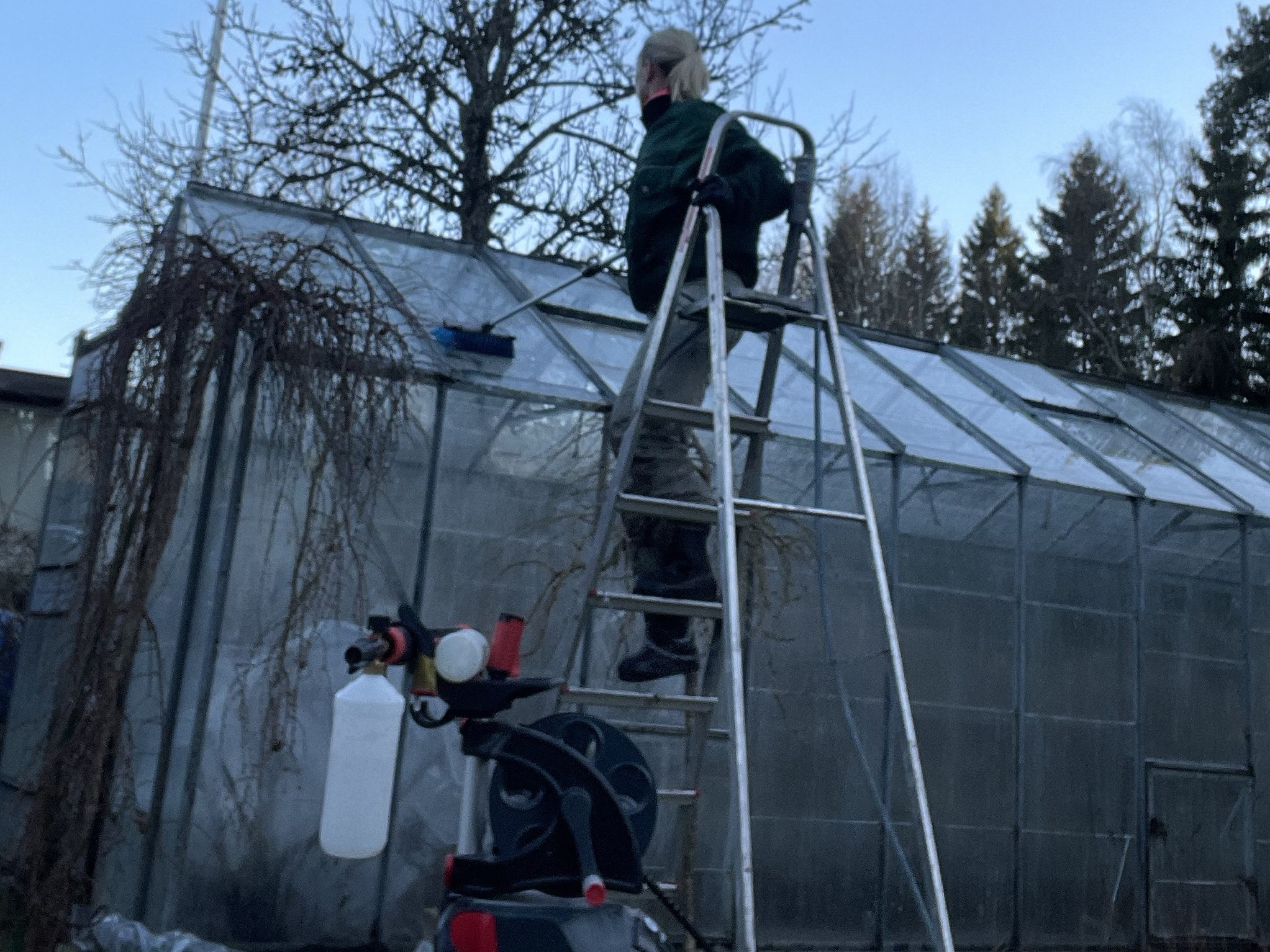 Today is the last day of March, and I can happily say that all the work done has been worth it. I have spent many days carrying, brushing, washing, fixing, scraping, rinsing, (wondering & questioning), singing, mumbling, wandering, and figuring things out. In the beginning, some challenges were getting the pressure washer working (because it is so darn powerful), but in the end, we managed to “hit the rhythm”, and the rest is history. Using the car wash brush with a long handle was such a good idea, too. The idea came to me while I was cleaning the glass with a sponge and a pink brush. Doesn’t sound too bad? Well, I think I had not yet mentioned that the greenhouse is 3 METER HIGH AND 8 METERS LONG. So, NO! A sponge and a brush were NOT an efficient idea. Mr. Car Wash Brush, on the other hand, was.