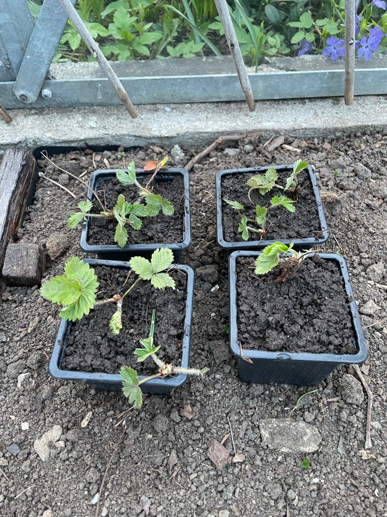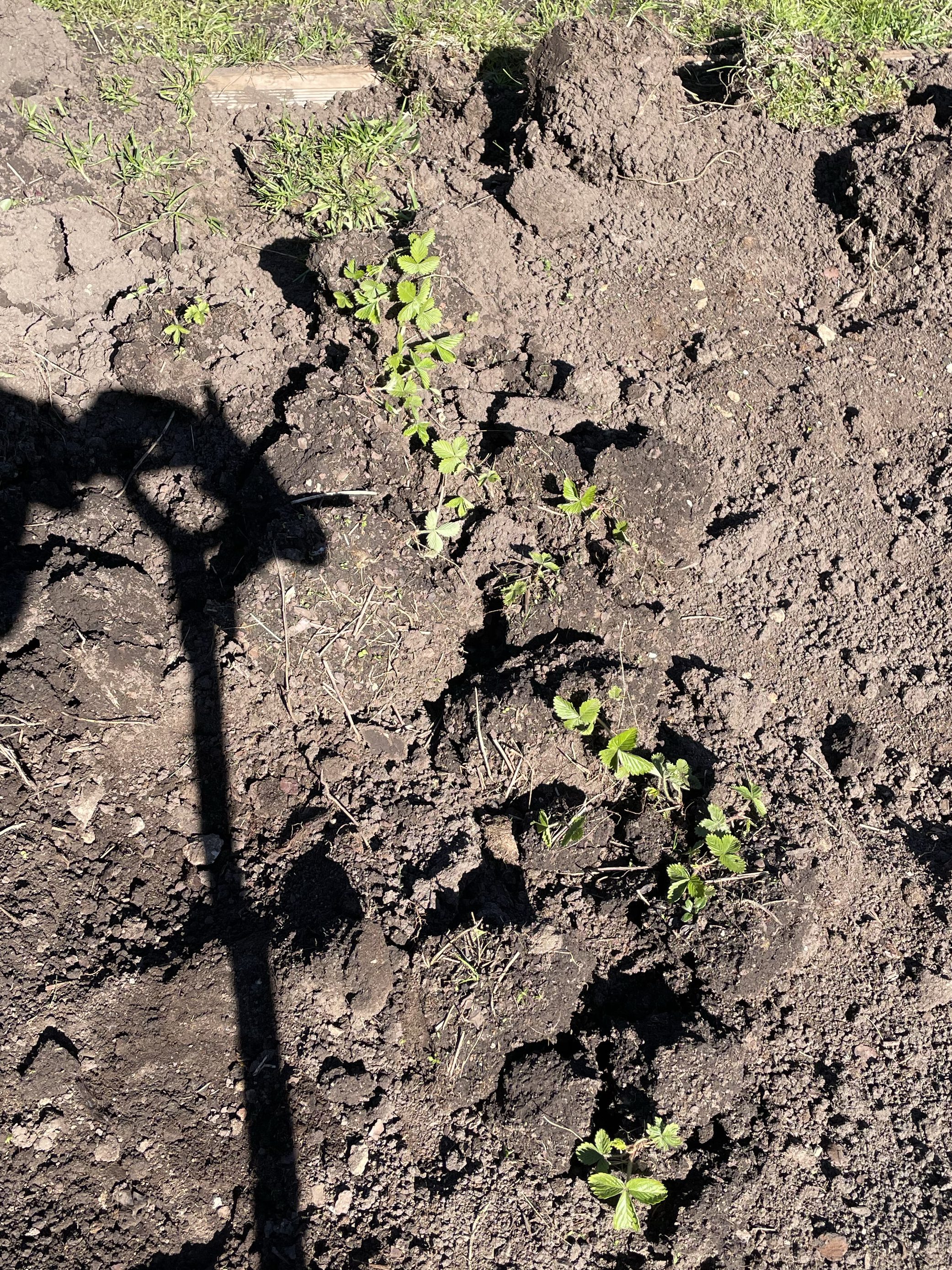 On each side of the garden plot, wild strawberries are growing. While I am shoveling the frames into the soil, I try to save as many as I can and replant them in pots. If they survive, I will put them somewhere in the greenhouse π