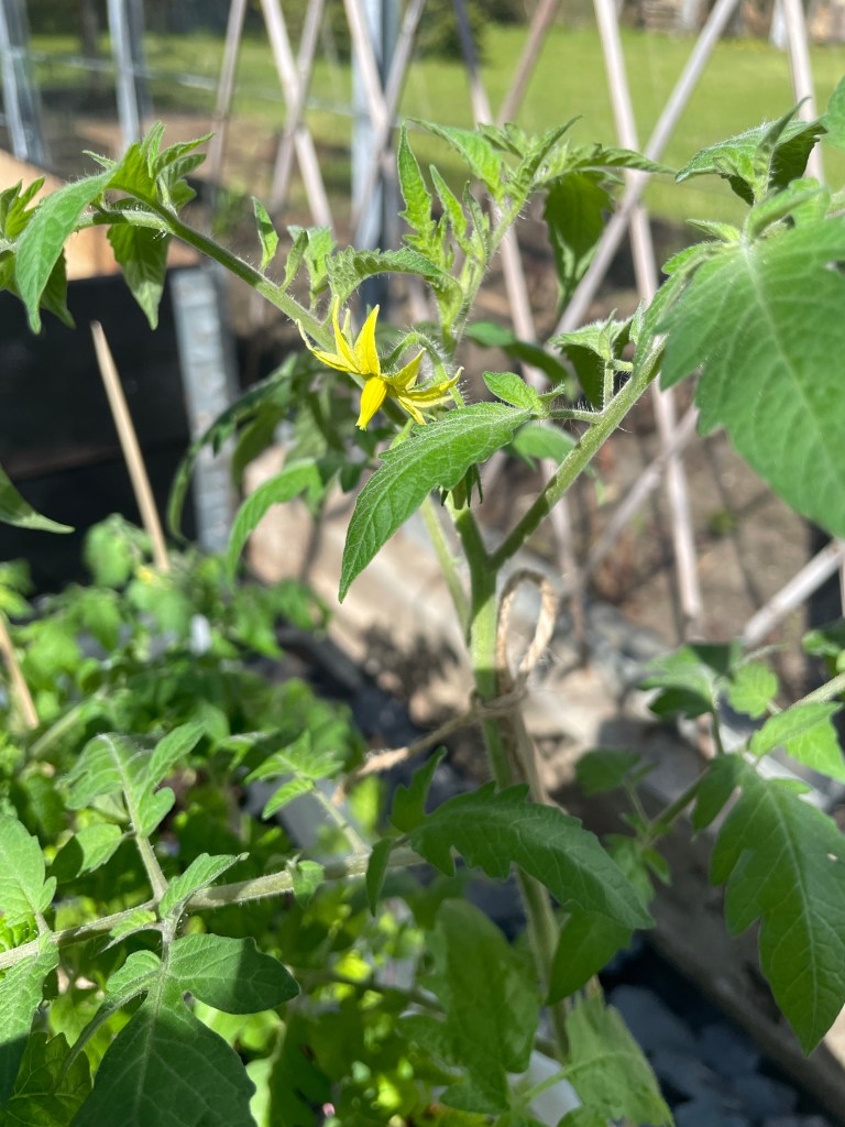 The Noire De CrimΓ©e, or Black Krim, tomato was the first to bloom. Also, the Veranda variety is slowly starting to bloom, and well, the peas keep coming too!
