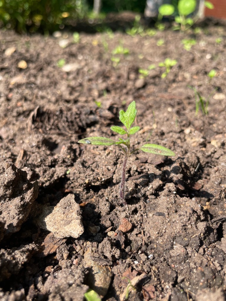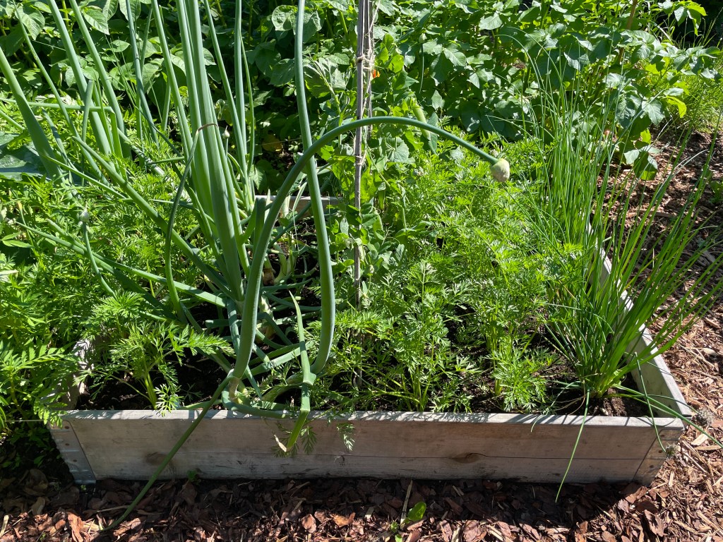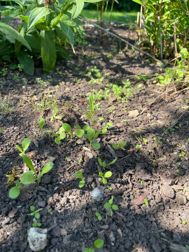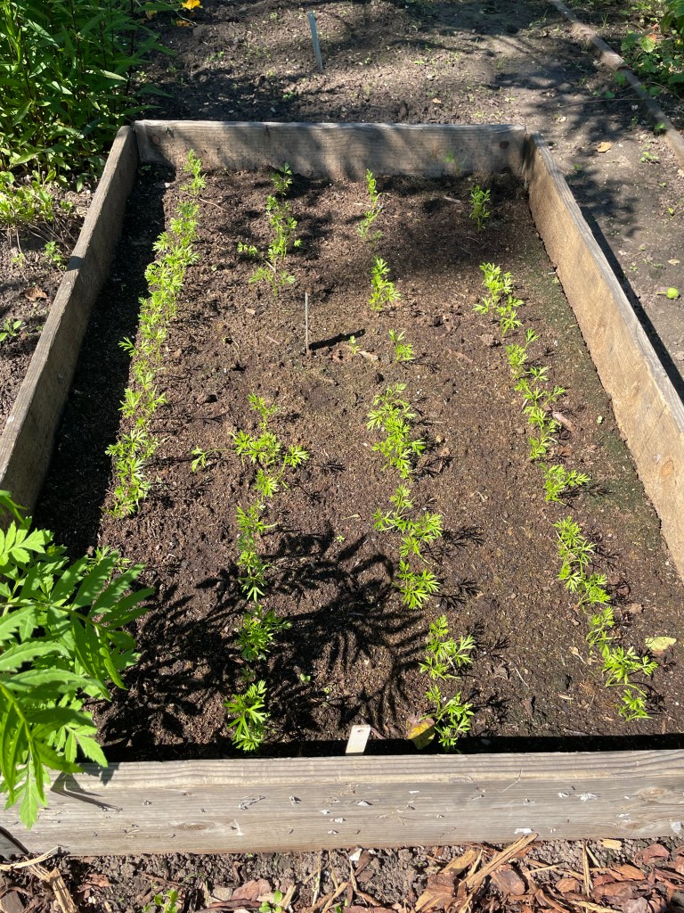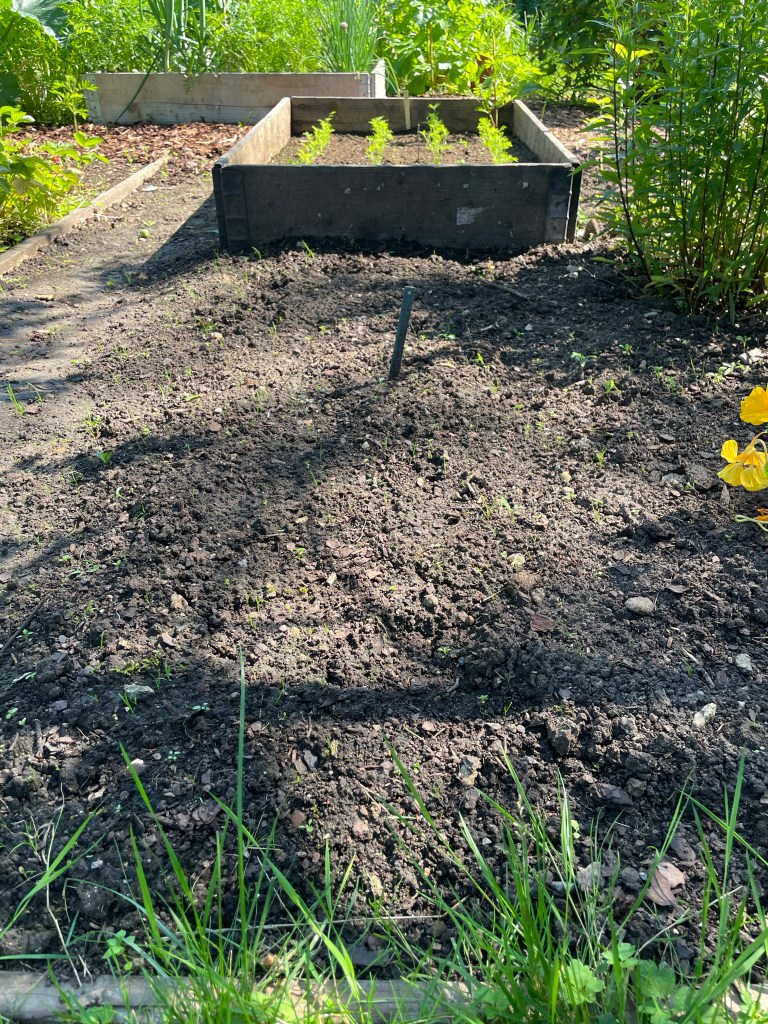 - Spring onion (which was already growing in the garden), carrot exp. 1, pea, and onion. Against all odds, even the pea is growing in this old soil.