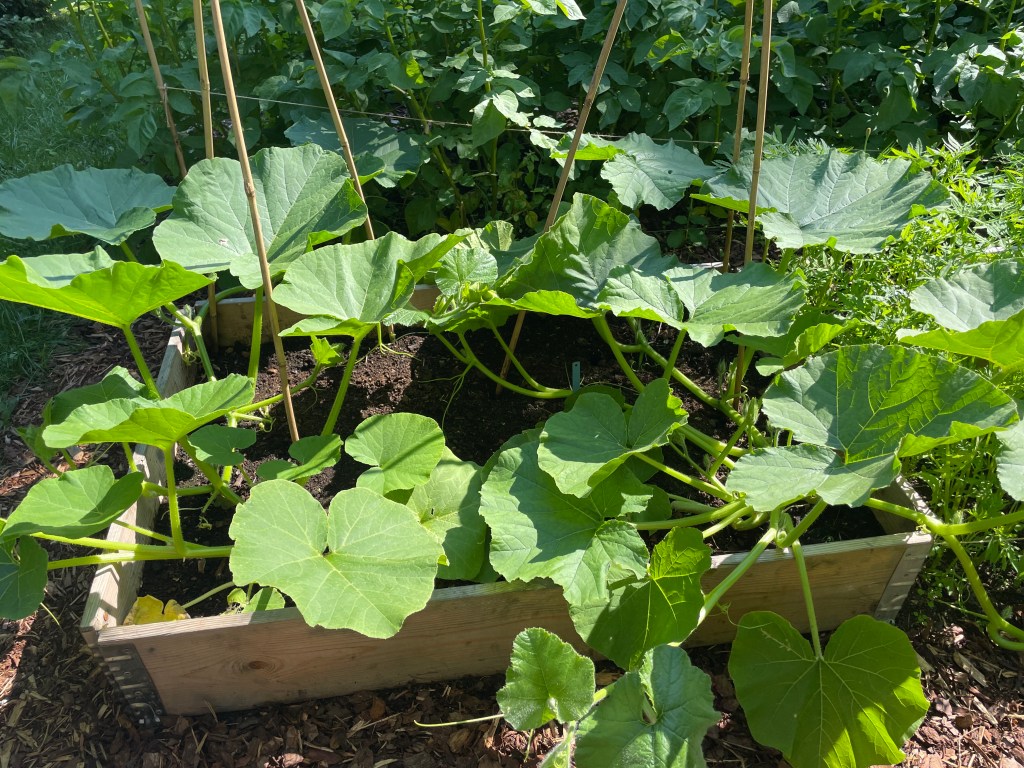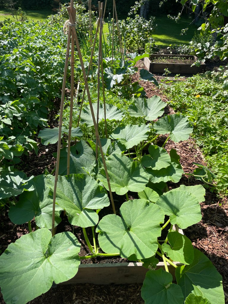 - Pumpkin and French bean. (Or what should have been a French bean). I have no clue what happened, but NONE of my five bean seeds that I sowed sprouted (neither inside the greenhouse, in garden beds, in a pot, nor in the garden bed outside). Hence, the reason why I initially put up the support canes, but now they will support the overly big pumpkin instead!