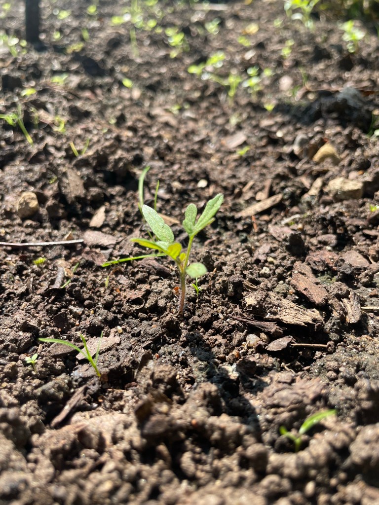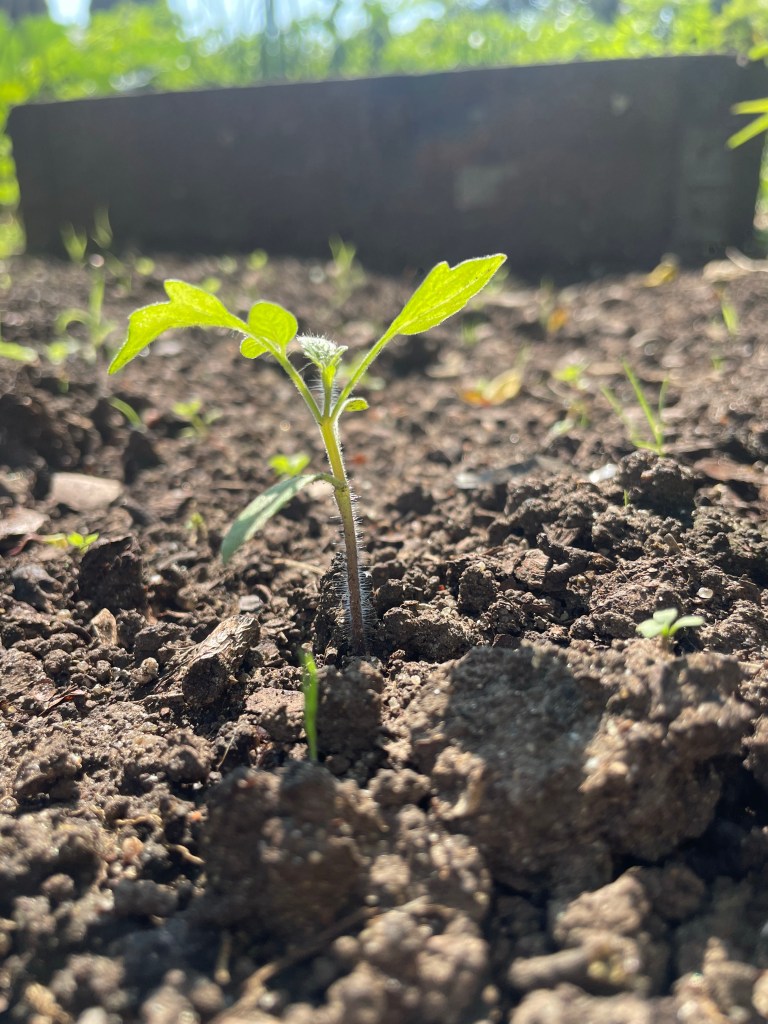 The thing here is that it has been two weeks and I still don’t see a single kale sprout. Instead, and for better or worse, I spotted THREE TOMATO sprouts in the kale bed! I cannot help but wonder, how did these get here? I mean, I am pretty sure these are tomatoes, right?