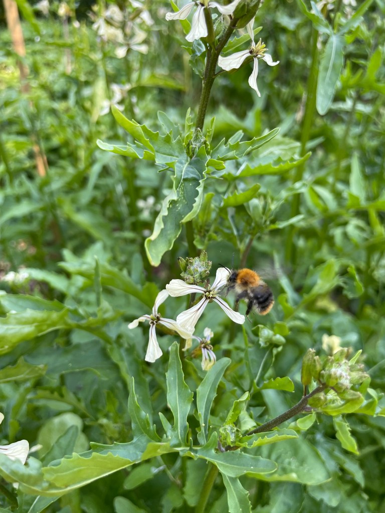 The leafy rocket salad and lettuce need to be mentioned here, too. But that rucola would be easy to grow, they said. Oh well, no, it wasn’t easy to grow, say I! I started with rucola and lettuce early on in the project. Just like I had underestimated the herbs, so I did with these as well. There were a couple of times that we enjoyed lettuce in salads or in a sandwich, but there we more times when I left it growing in the garden. The same cannot be said about rocket salad, but despite its weak presence at a dinner table, the bees got even more of it. I have sown some more of this rocket salad in the garden plot in the hopes of being able to enjoy it more this time.